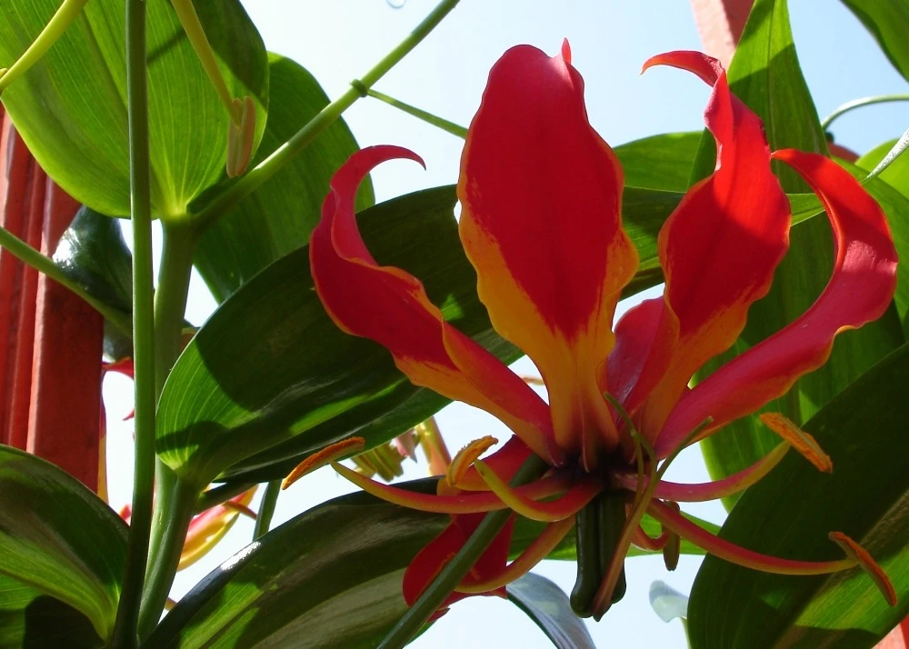 le lis de malabar exotique est un abrisseau vivace grimpant qui atteint une hauteur jusqu’à deux mètres à l’aide d’un support pour plantes grimpantes et qui peut être bien entretenu en pot. Ses inflorescences sont durables une fois coupées. Les fleurs du lis de malabar sont rouge feu avec une bordure jaune vif et se montrent à partir de juin. Elles font penser à une couronne ou à un papillon avec ses six pétales frisées qui sont courbées vers l’extérieur. Les rameaux délicats deviennent très longs au cours de l’été et ont besoin d’un support auquel le lis peut s’attacher avec les pointes de ses feuilles.