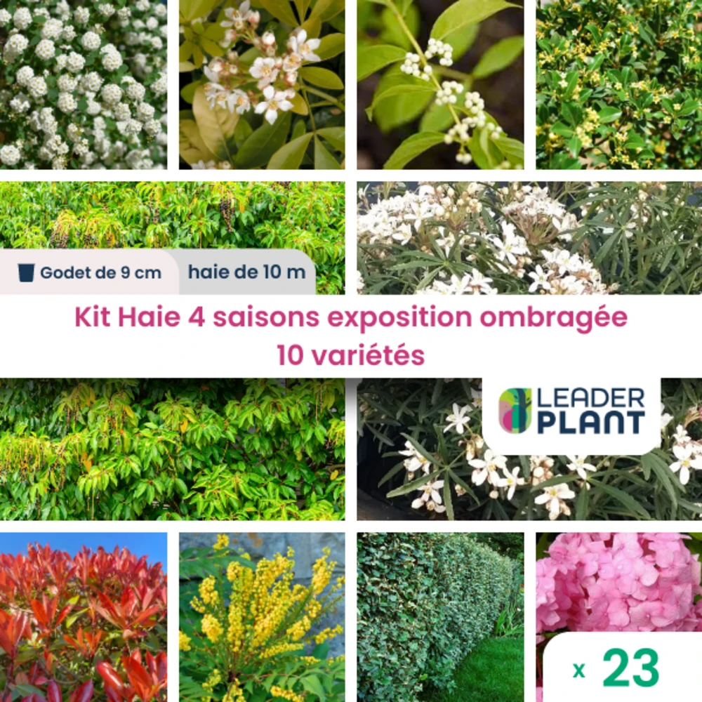 kit haie 4 saison exposition ombragée – 10 variété – lot de 23 plant en godet pour une haie de 10m en quinconce